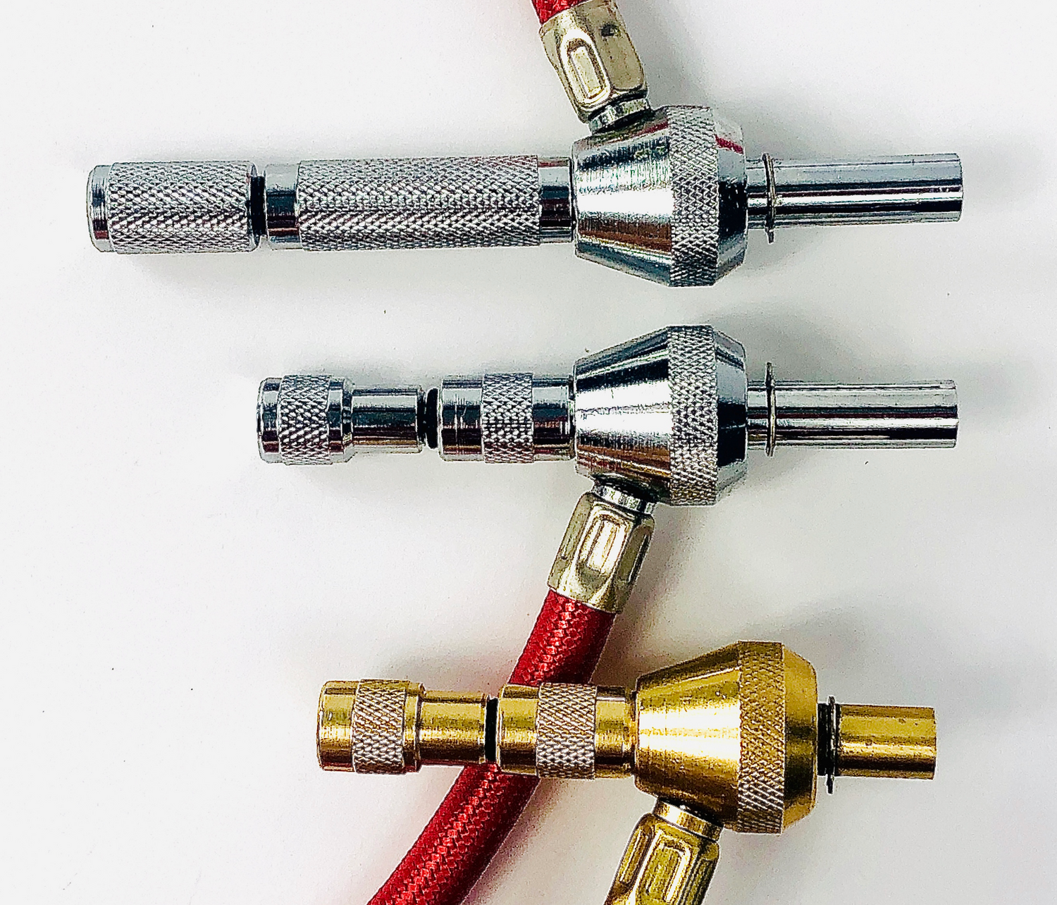 Once the chuck is screwed in place, use the self-contained Schrader tool to remove the valve core keeping it captured. Slide the Chuck body back to allow air to escape or slide it forward to read the tire pressure. Once desired pressure is achieved, Reinstall the valve core before unscrewing the chuck and replacing the valve cap.