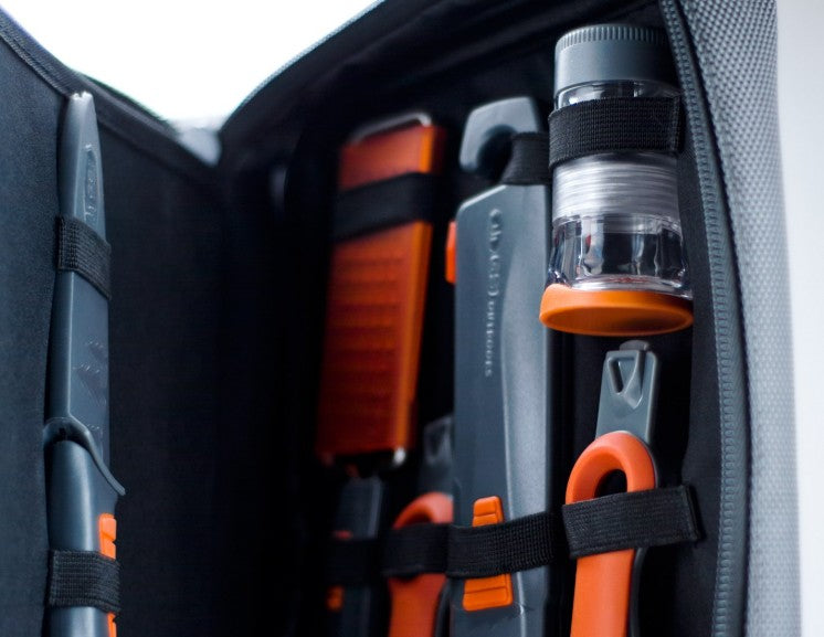 • Included: Mini Cheese Grater, Collapsible Whisk, Pivot Spoon, Pivot Spatula, Utility Knife, 12 pc. Cutlery Set, Spicer, 2 Condiment Containers, Cutting Board, Scrubber, Camp Towel, Ballistic Nylon Case