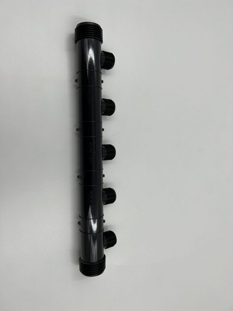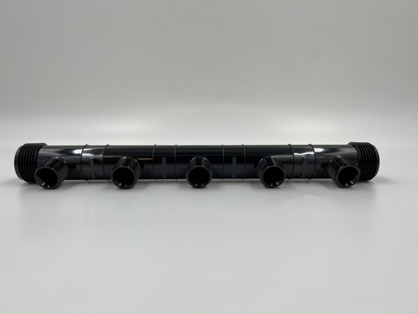 Zurn 1″ diameter Polysulfone QuickPort Manifold comprised of five (5) 1/2″ male straight pipe thread outlets and two 1″ male pipe thread inlets.