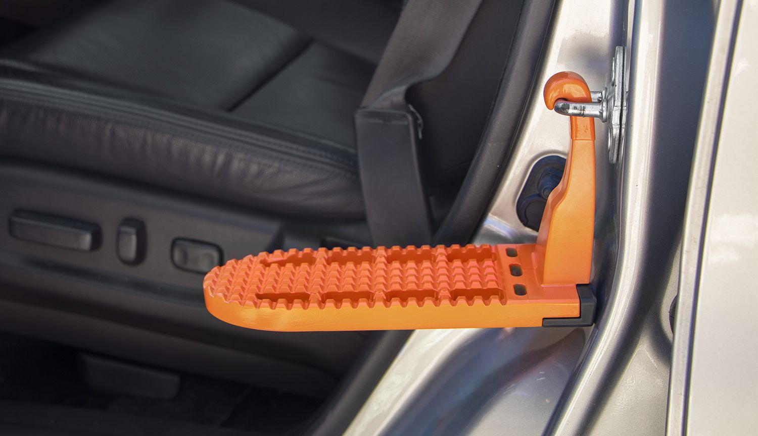The Step’s rubber bumper and coated hook protect your vehicle’s door frame. Store the Step in your vehicle’s center console, glove box, or spare tire compartment when not in use.