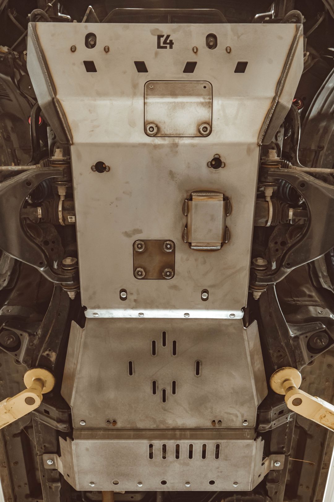 - Three separate skid plates that bolt together to protect the engine, transmission, and transfer case