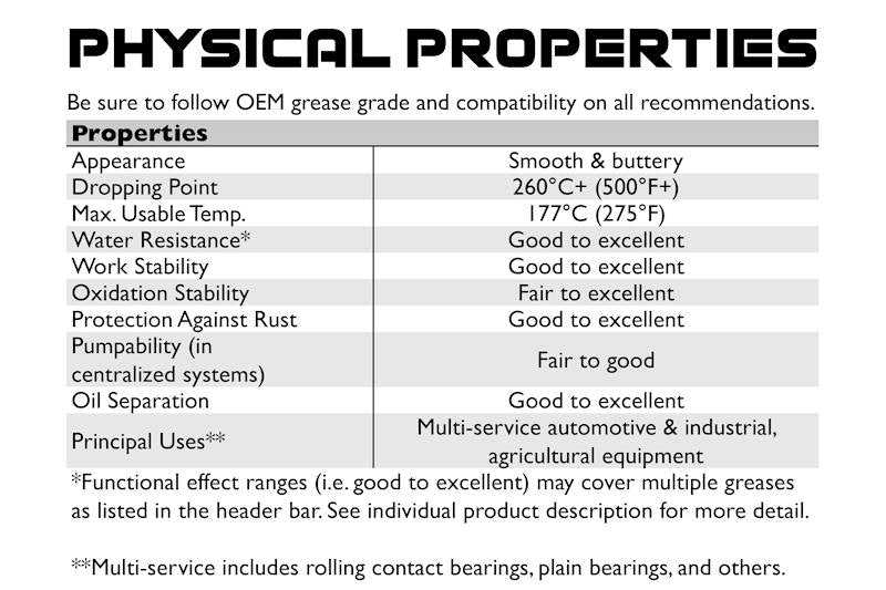 • This heavy-duty lithium complex grease contains 5% moly for extra protection against severe wear under shock loads.