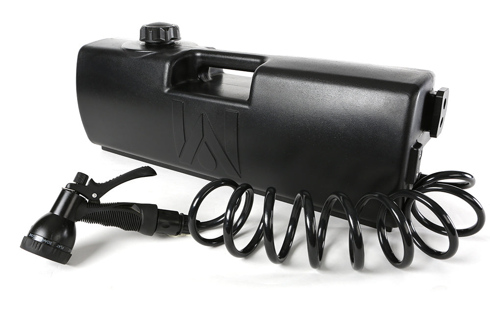 The WaterPORT Day Tank provides pressurized water in a convenient vehicle mounted solution. The tank comes complete with spray nozzle and hose. When filled with a garden hose using the quick release system, the tank pressurizes in seconds and stores 3.8 gallons of pressurized water for weeks. The tank can be refilled from the large fill cap and pressurized with a hand pump when a hose is not available. The neoprene sleeve helps insulate the potable water and the carrying handle is convenient for moving the Day Tank from vehicle to the camp site, beach, or wherever it is needed.