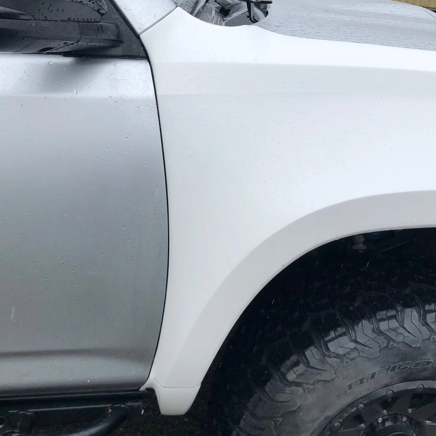 5th Gen. 4Runner fender flares, hand-laid in the USA. Price includes set of two fenders and filler pieces (driver and passenger side). 3" Toyota fenders come standard in semi-gloss white. Bolt-on installation. Each 4Runner fiberglass fender is made specifically for your model and year and designed for a seamless transition between the factory panels and our aftermarket body panels.