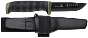 A durable outdoor knife with friction grip suitable for tough tasks in the field. The hardwearing textile beltloop allows up to 80mm wide belts and is equipped with a pocket for a fire starter. The blade has a scandi grind and is made from Japanese knife steel, 3.0 mm carbon steel that has been hardened to 58–60 HRC and has a rust protective electrophoretic deposition coating to withstand corrosion. The grinded spine of the blade is designed for starting a fire with a fire starter.